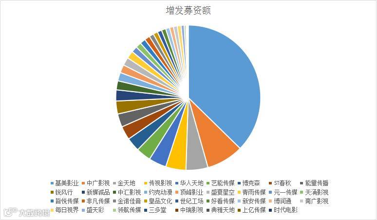 截至5月13日,35家新三板影视公司实施了增发,共计募集资金29.74亿元,44家公司没有增发。基美影业募资额最高,为11.1亿元,占总募资额的37.32%,中广影视和金天地紧随其后,前三家公司的融资额加起来已经超过总额的一半,达50.54%。
