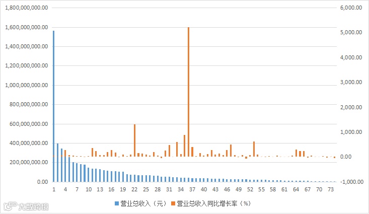 在其余75家公司中,营业总收入在1000万元-5000万元的公司最多,有34家,占比45.33%;其次是1亿-5亿,有18家,占比24%。5亿-10亿区间出现了断层,没有公司达到,大地院线一枝独秀,营业收入居首,高达15.59亿元,占总体收入的24.01%。