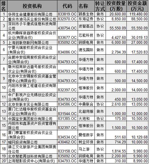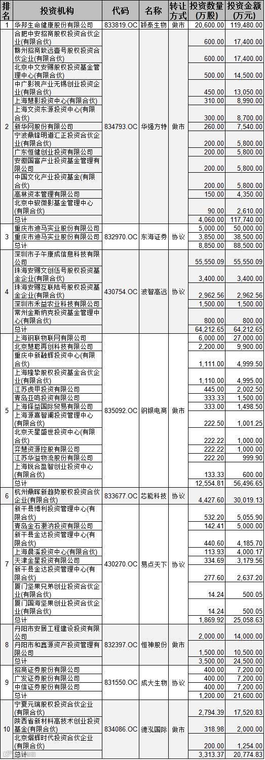 如按各个机构对单一创新层公司的累计投资金额计算,颖泰生物仍占据第一名,第二、三名分别是华强方特11.77亿元、东海证券8.85亿元。