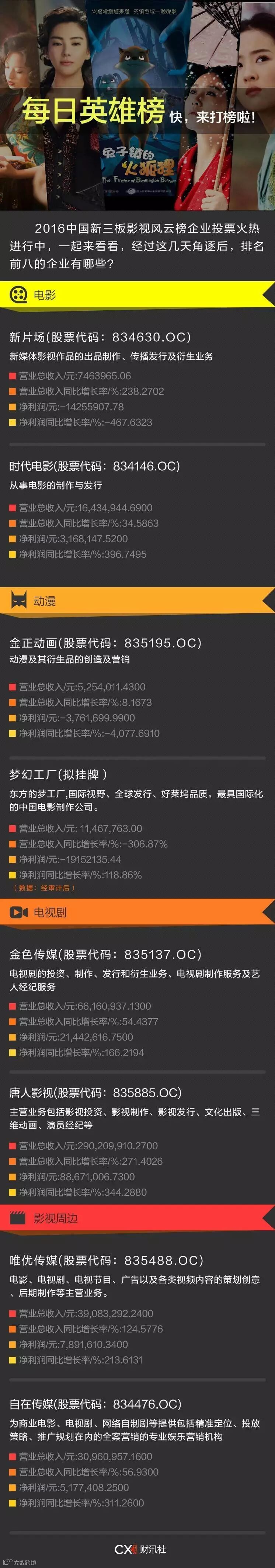 经过这周持续的投票评选,2016年中国影视新三板风云榜活动已进行了一大半,今日的排名较昨日相对稳定,但仍有两位意想不到的选手冲进了前八,一家是主营动漫及其衍生品创造及营销业务的“金正动画”,另一家是主营电视剧的投资、制作、发行和衍生业务、电视剧制作服务及艺人经纪服务的“金色传媒”。别小看了今日风云榜上的这两匹黑马哦,他们可分别占据了动漫领域和电视剧领域最具投资价值的榜首呢!