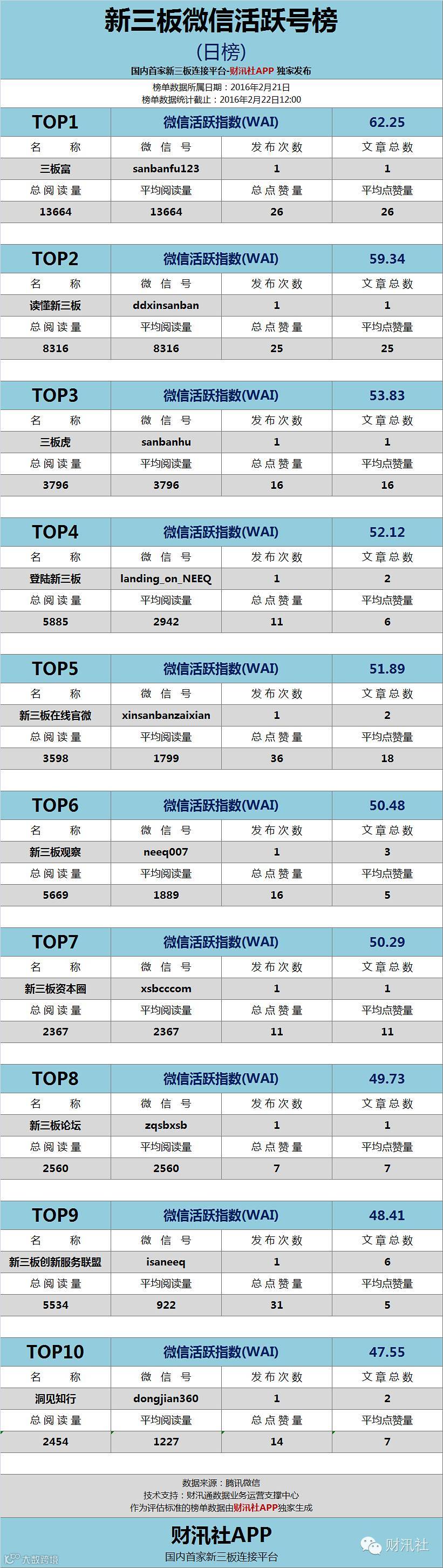 本期活跃号榜的监测范围是2016年2月21日新三板领域各微信公众号的相关指标。