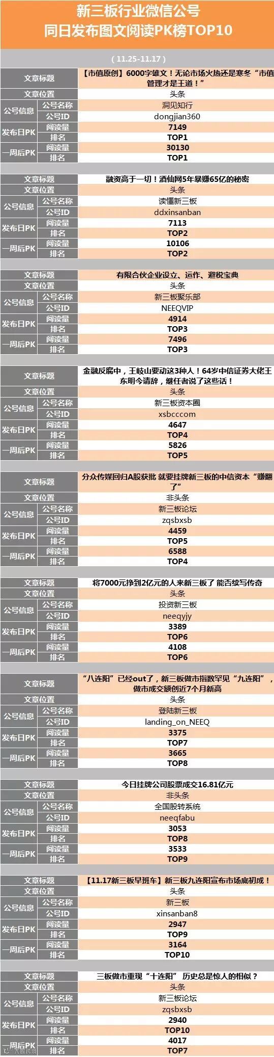国内首家专业的新三板数字化投融传播平台——财汛社的运营团队(人称“社掌”),于2015年11月20日起推出独家特色产品——新三板行业微信公号同日发布图文阅读PK榜TOP10。