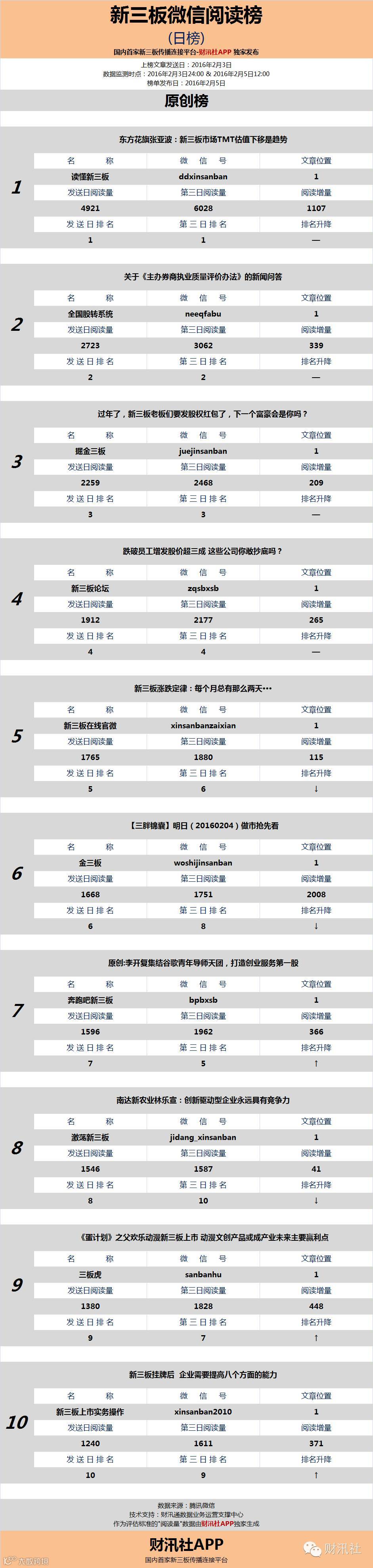 今日《新三板微信阅读榜》(原创榜)文章为上榜公众号于2016年2月3日发送。社掌归纳文章重要信息: