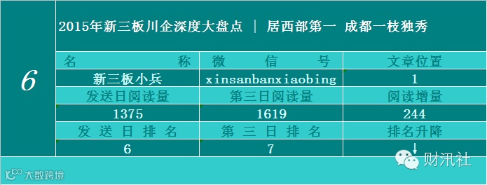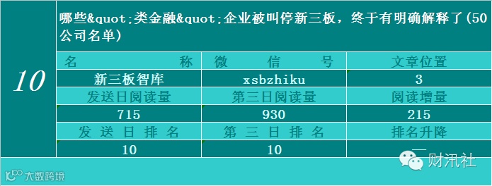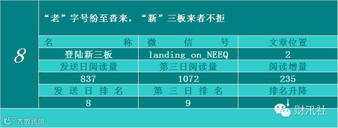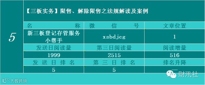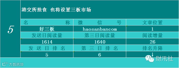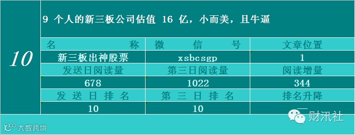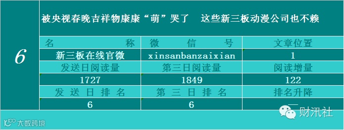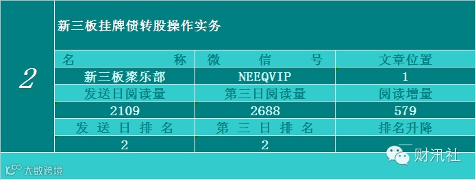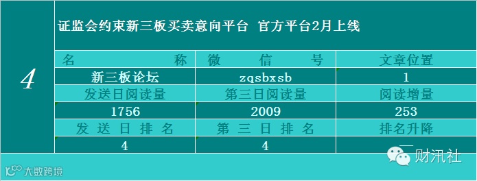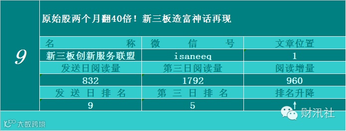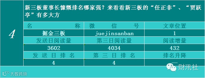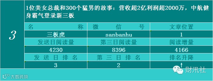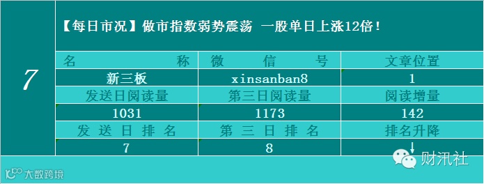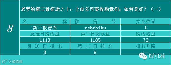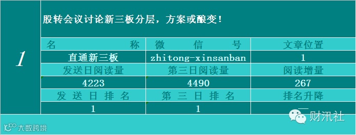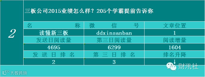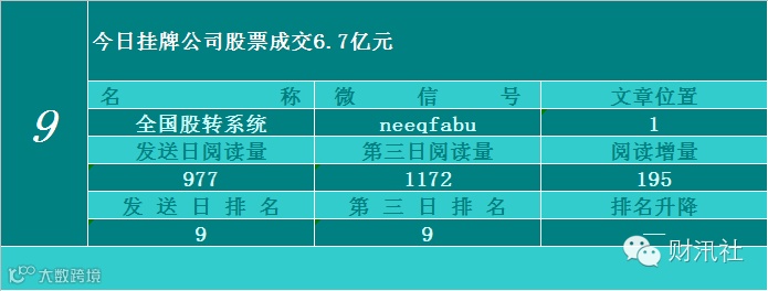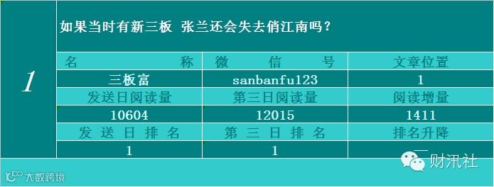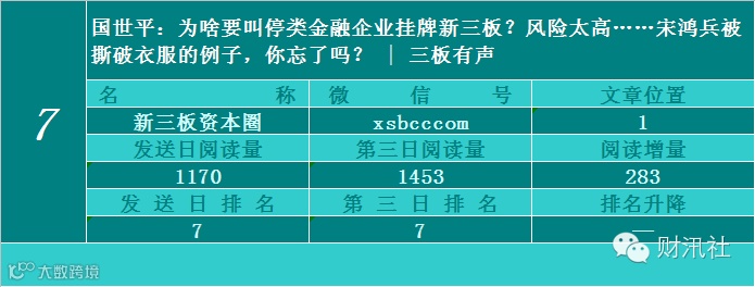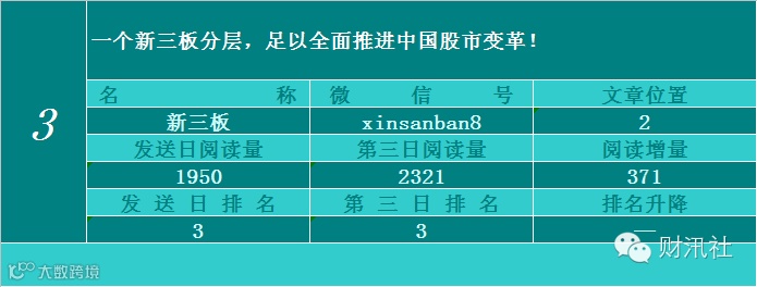 一日定座次,三日分高下。由@财汛社(ID:caixunshe)独家发布的《新三板微信阅读榜》以文章发送日的阅读量作为排名依据,而以第三天中午的阅读量数据作为文章可读性和话题性的孰优孰劣之参考,同时也体现公众号用户的活跃度和粘性。