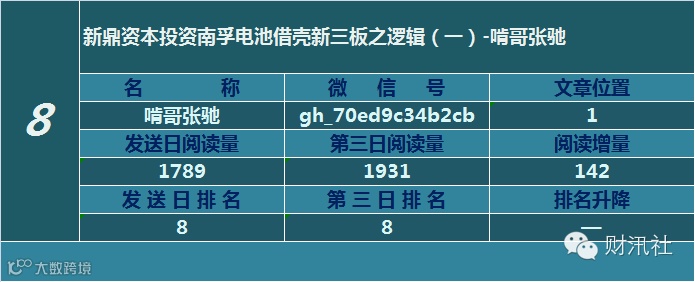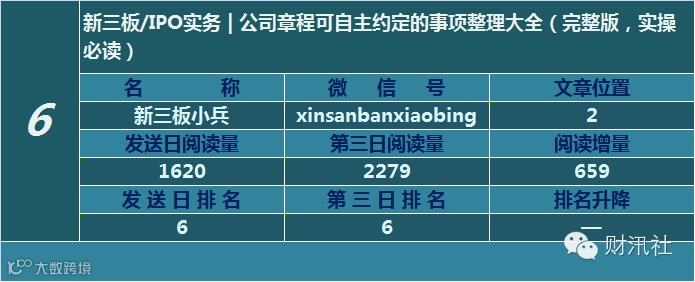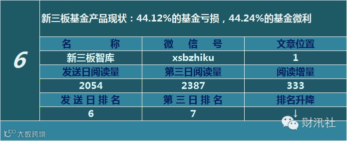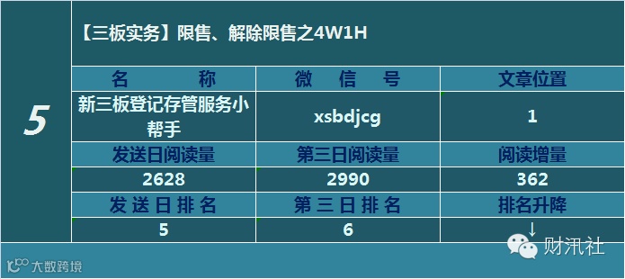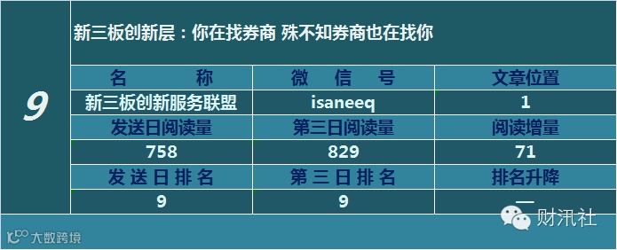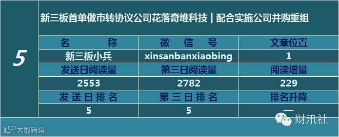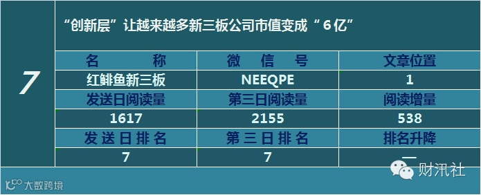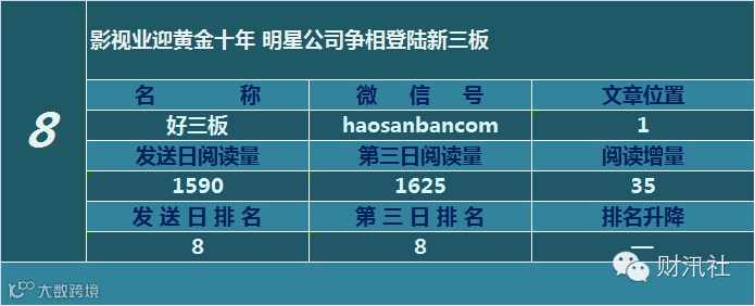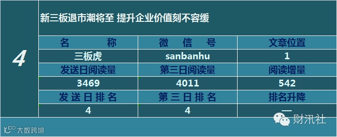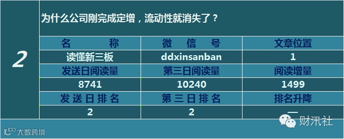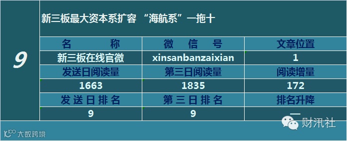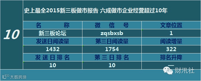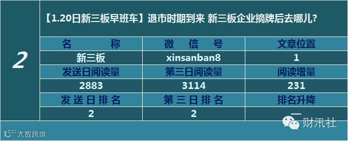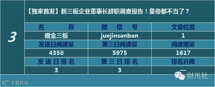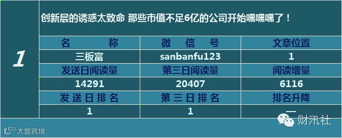 一日定座次,三日分高下。由@财汛社(ID:caixunshe)独家发布的《新三板微信阅读榜》以文章发送日的阅读量作为排名依据,而以第三天中午的阅读量数据作为文章可读性和话题性的孰优孰劣之参考,同时也体现公众号用户的活跃度和粘性。