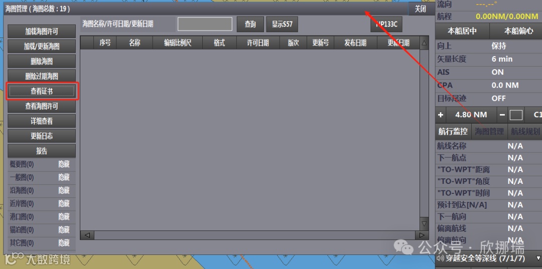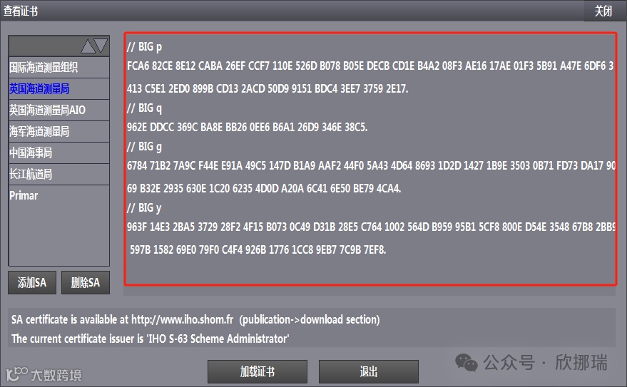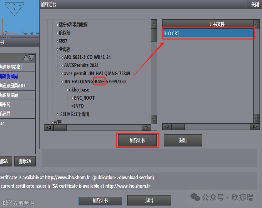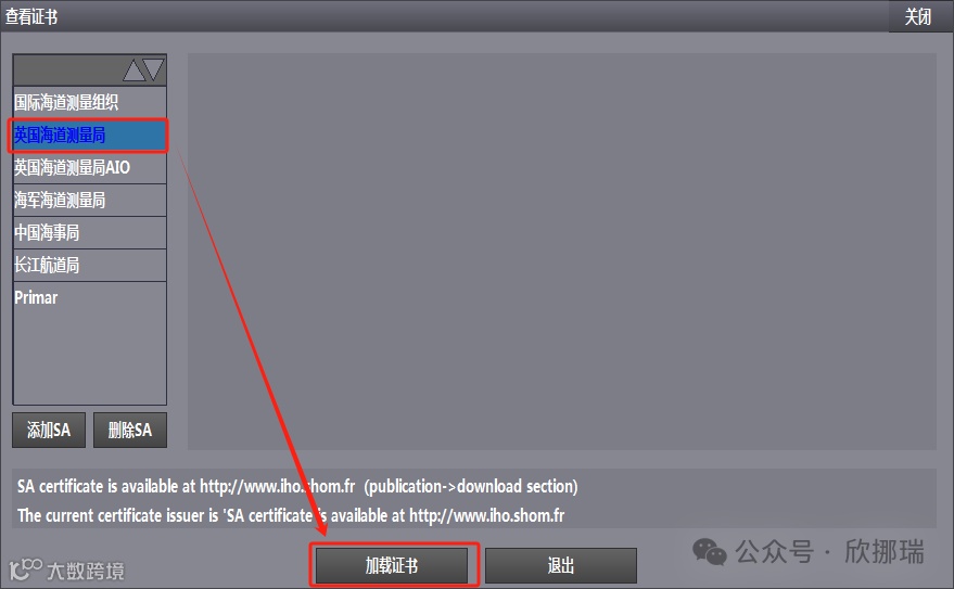 点击海图管理->查看证书->英国海道测量局->加载证书。在UKHObase数据中找到IHO.CRT并点击选中,点击加载证书,完成加载。
