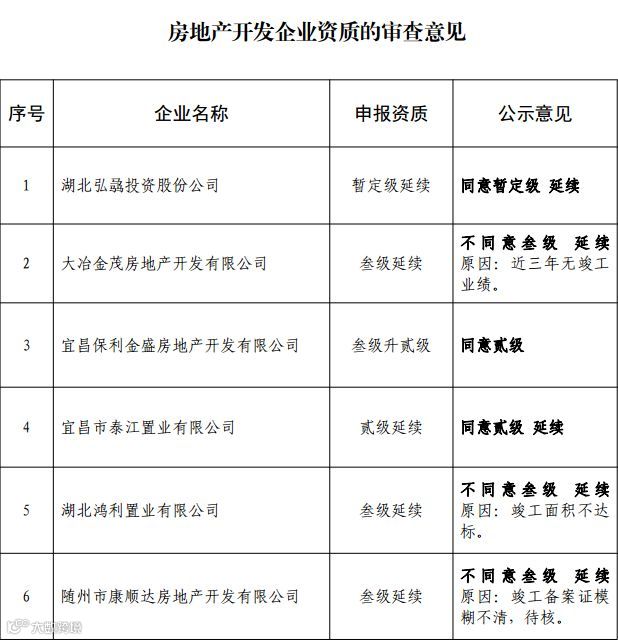 5月29日,湖北省住建厅发布了关于房地产开发企业资质审查意见的公示,根据《中华人民共和国行政许可法》等法律、法规和有关企业资质管理规定,湖北省住建厅组织对房地产开发企业所提交的申报资料进行了审查。并将现将审查意见予以公示(详见附件),具体如下。