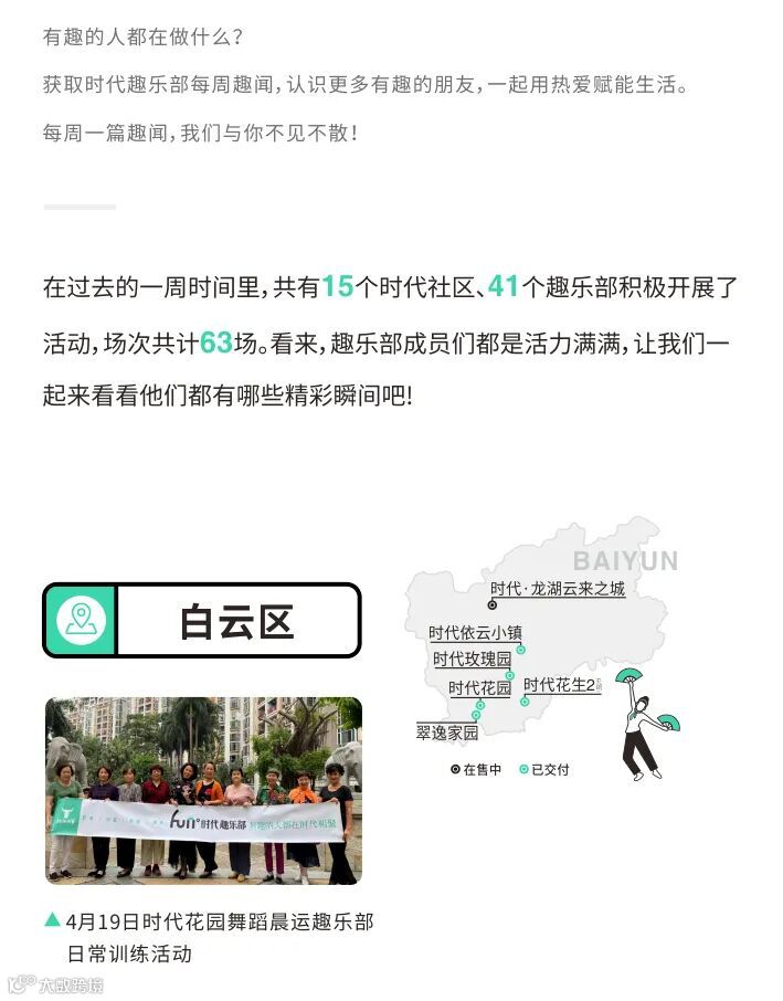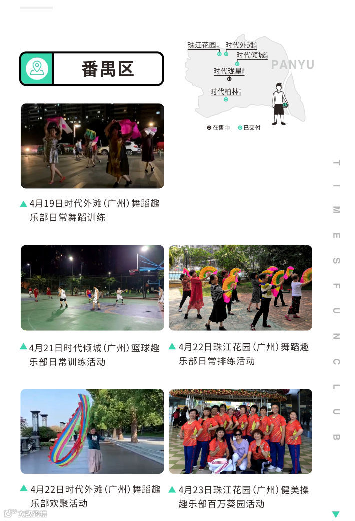目前,广州时代趣乐部已经覆盖天河、海珠、白云、番禺、黄埔等区域共20个社区,建立了89个趣乐部,共有5697名志同道合的时代业主加入了趣乐部的大家庭。