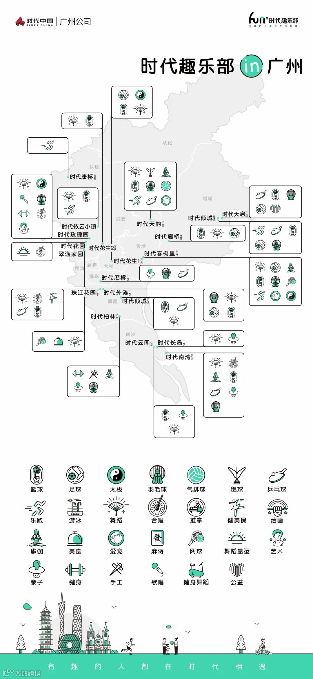 目前,广州时代趣乐部已经覆盖天河、海珠、白云、番禺、黄埔等区域共20个社区,建立了89个趣乐部,共有5697名志同道合的时代业主加入了趣乐部的大家庭。