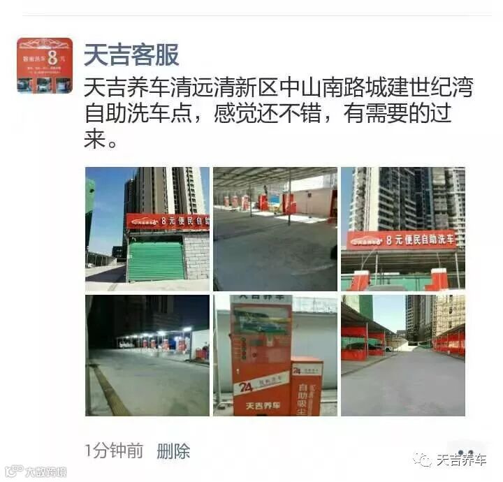4.朋友圈发以下图片(配文:天吉养车清新区中山南路城建世纪湾自助洗车点,感觉不错,有需要的过来)可参考上图。