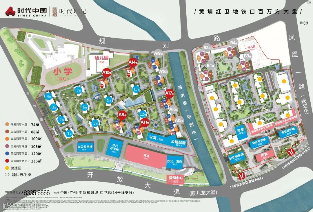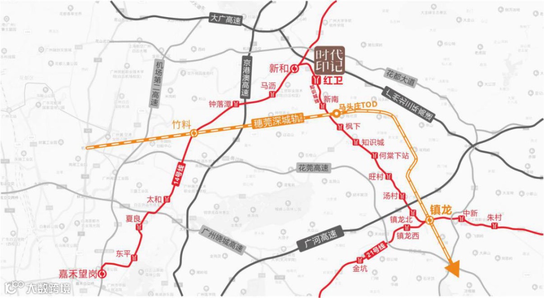 时代印记位于黄埔区14号支线红卫站口,三条地铁线环绕。