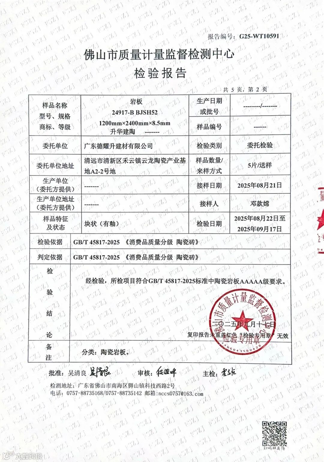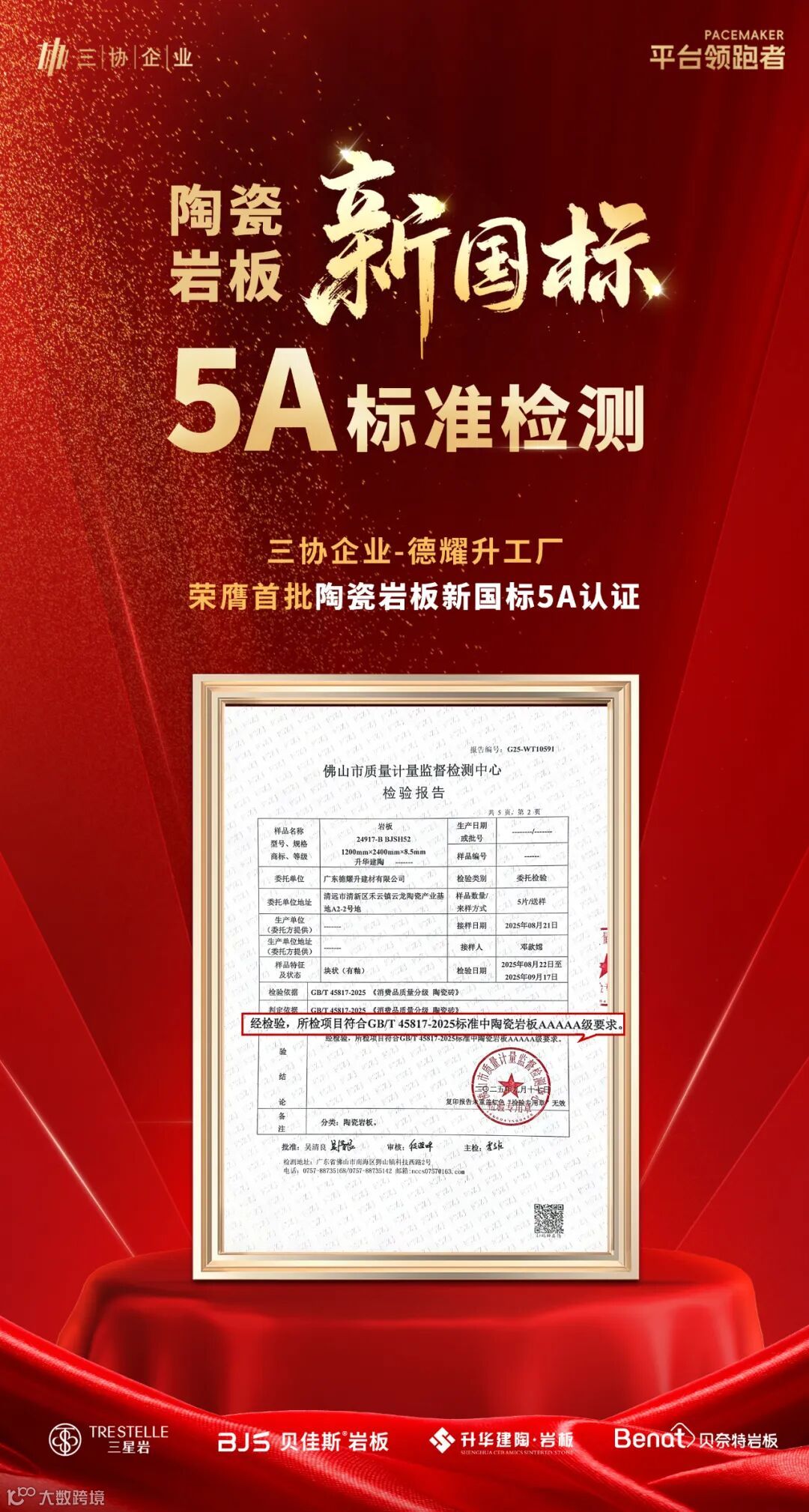 2025年10月17日,三协企业旗下核心生产基地——德耀升工厂正式通过佛山市质量计量监督检测中心权威认证,送检岩板全部指标均达到GB/T 45817-2025标准中陶瓷岩板AAAAA级要求,成为新国标实施前行业首批获此殊荣的企业之一!这一成果标志着德耀升工厂在陶瓷岩板品质控制、技术创新与生产工艺上已跻身国际顶尖水平,为三协企业“国际美学×本土效率”的品牌战略再添硬核注脚。
