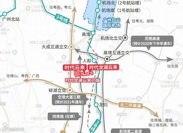 时代龙湖云来之城凭借雄踞地铁3号线。通过机场高速、空港大道、机场第二高速,广州绕城、花莞高速等形成“三纵三横”路网,便捷通达全城,构建直抵“白云新城”、“珠江新城”、“棠溪TOD”和“火车站商圈”四大CBD交通格局。