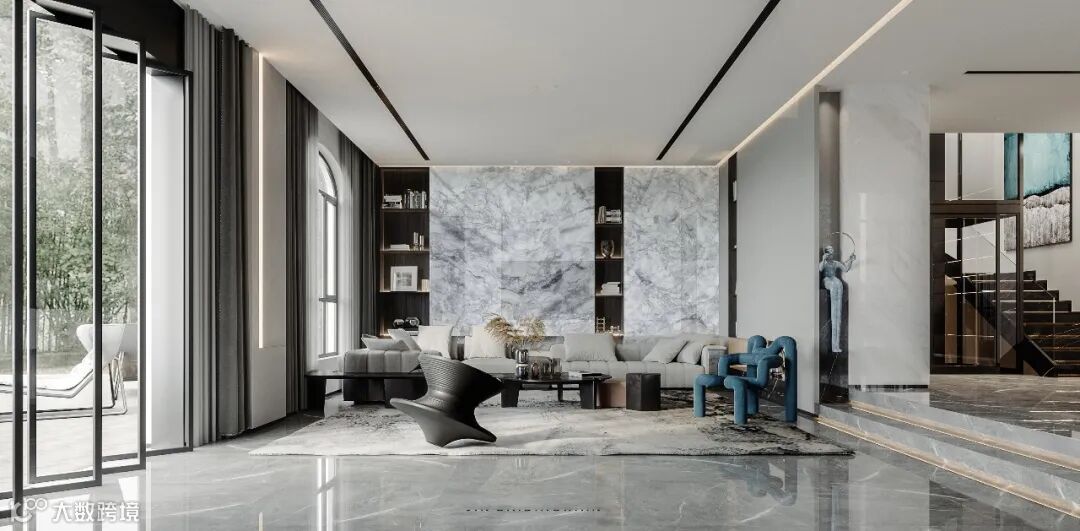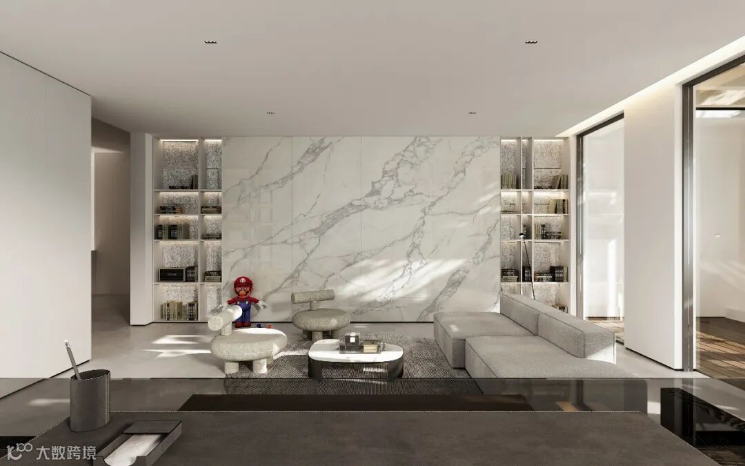 岩板的丰富纹理让整个客厅变得十分惊艳,而将生活中常使用的物品收纳到背景墙中,合理地利用了空间的实用价值,整体的空间显得更加简洁雅致。