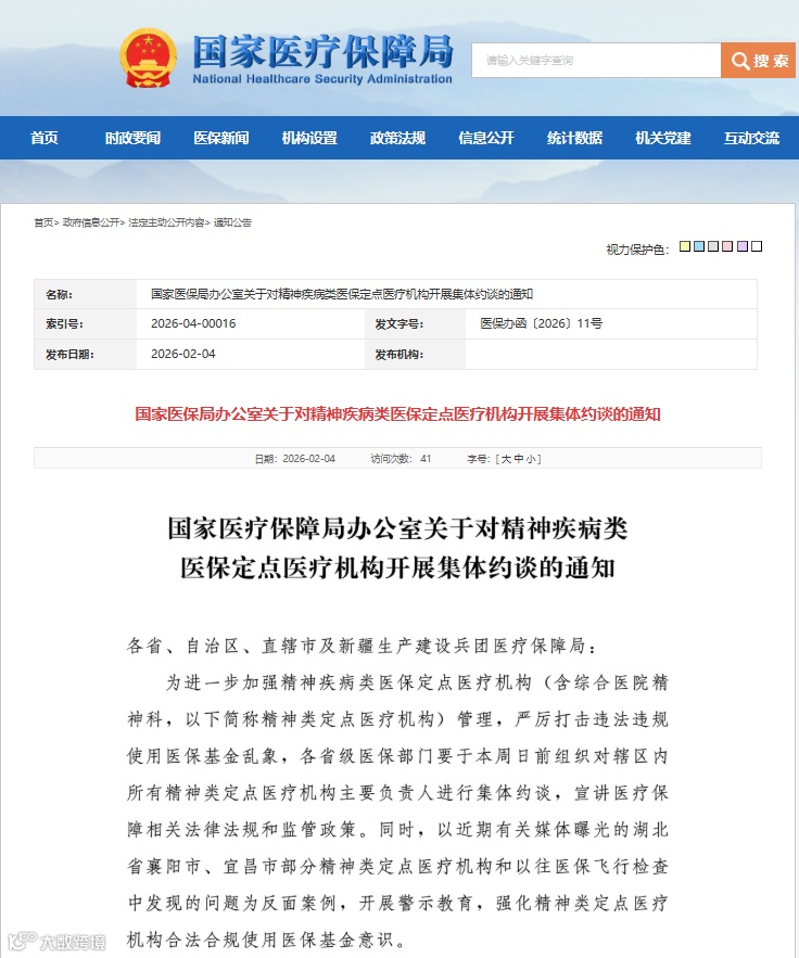 据央视新闻消息,2月4日,国家医保局发出通知,为进一步加强精神疾病类医保定点医疗机构(含综合医院精神科,以下简称精神类定点医疗机构)管理,严厉打击违法违规使用医保基金乱象,各省级医保部门要于本周日前组织对辖区内所有精神类定点医疗机构主要负责人进行集体约谈,宣讲医疗保障相关法律法规和监管政策。