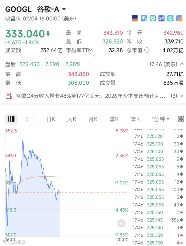 美股盘后,科技巨头谷歌的母公司Alphabet披露的财报显示,公司2026年资本支出将达到惊人的1750亿美元至1850亿美元,大超市场预期。受财报影响,其股价盘后剧烈波动,截至发稿,跌超1%。