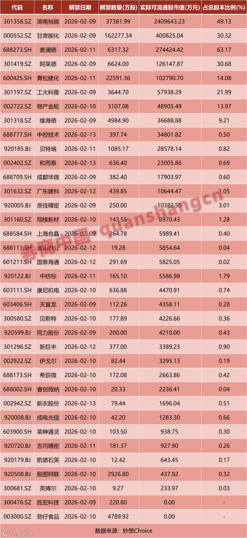 数据显示,本周(2月9日—2月13日)共有36家公司限售股陆续解禁,合计解禁26.11亿股,按最新收盘价计算,解禁总市值为364.99亿元。