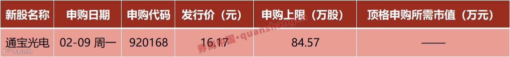 本周(2月9日—2月13日)有1只新股发行,周一:通宝光电。