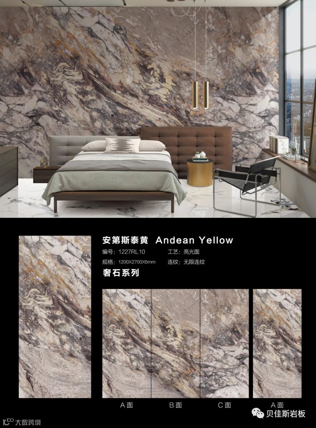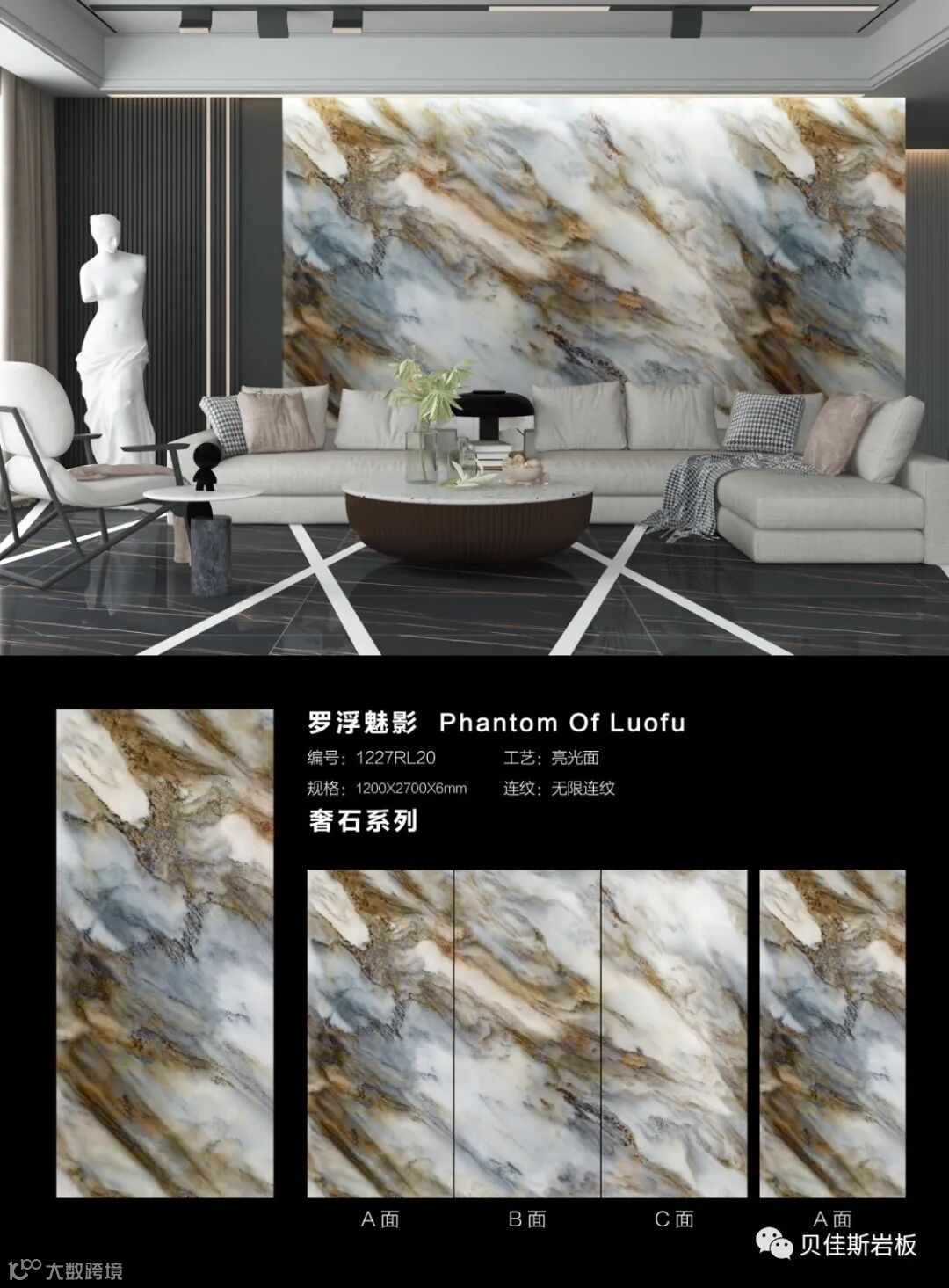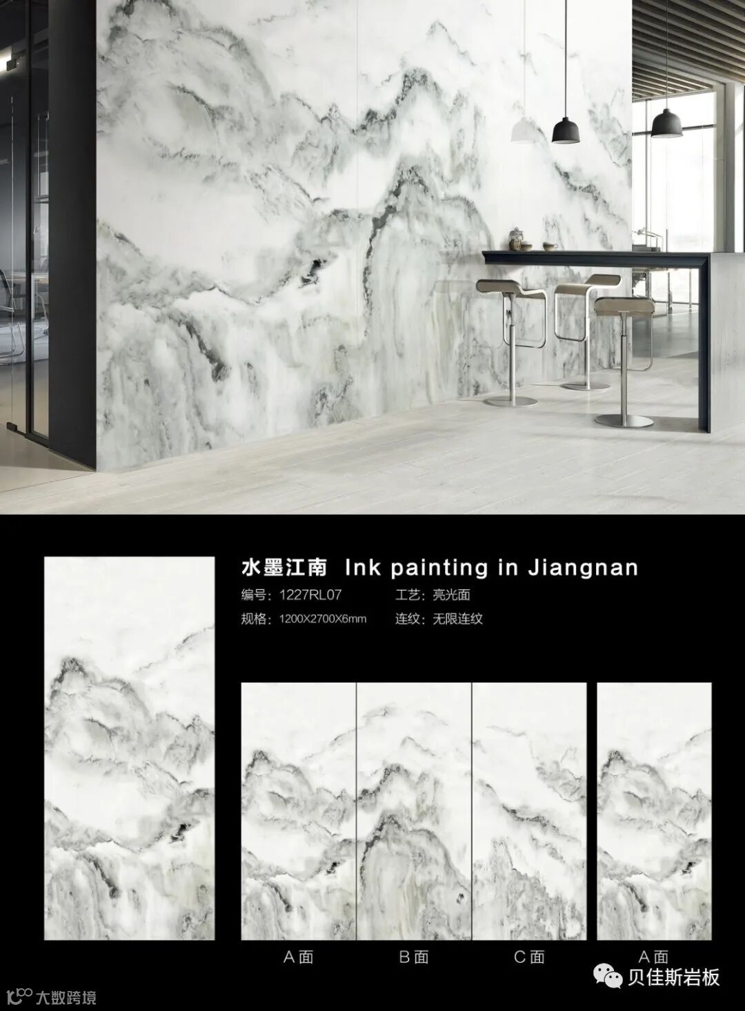 原创花色★75度透光岩板★国际模范规格★6mm厚干粒工艺★无限循环连纹铺贴等独有特色,实现在空间中自然衔接,无限延伸,可消除纹理割裂造成的视觉缺陷,实现空间的无限大。