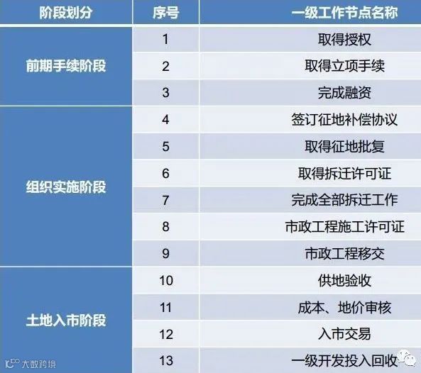 一般而言,规范的一级开发主要子工作阶段包括取得授权、完成立项核准、融资、签订征地补偿协议、取得征地批复、取得拆迁许可证、完成拆迁、市政工程施工许可证获取、市政工程移交、供地验收、成本与地价审核、土地入市交易和一级市场投入回收。在实际操作中,这些节点在时间上存在交叉性。