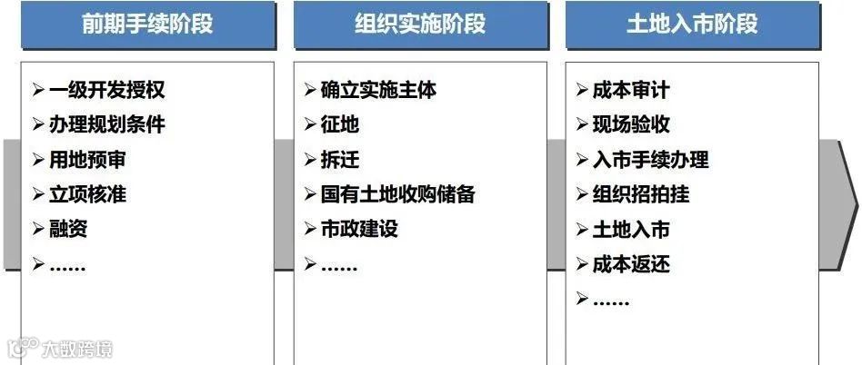 土地一级阶段包括“前期手续阶段”、“组织实施阶段”和“土地入市阶段”。