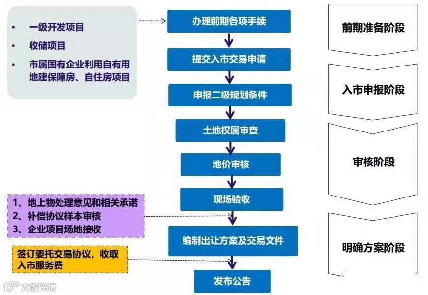 土地入市阶段需要经过现场验收、地价审核、其他入市手续办理、土地市场与入市交易。
