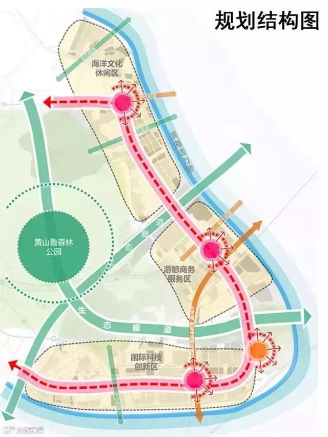 以黄山鲁公园为核心,串联南沙岛的风情大道,展示富有形象魅力的滨海活力带。