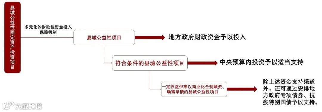 各地区要坚持“资金跟着项目走”,落实政府投资重点支持“两新一重”建设的要求,针对县城公益性固定资产投资项目,设计多元化的财政性资金投入保障机制。县城公益性项目主要通过地方政府财政资金予以投入,符合条件的县城公益性项目可通过中央预算内投资予以适当支持。对其中有一定收益但难以商业化合规融资、确需举债的县城公益性项目,除上述资金支持渠道外,还可通过安排地方政府专项债券、抗疫特别国债予以支持。