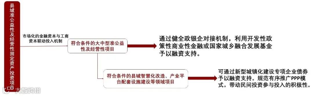 各地区要针对县城准公益性及经营性固定资产投资项目,设计市场化的金融资本与工商资本联动投入机制。对符合条件的大中型准公益性及经营性项目,可通过健全政银企对接机制,利用开发性政策性商业性金融或国家城乡融合发展基金予以融资支持。对符合条件的县城智慧化改造、产业平台配套设施建设等领域项目,可通过新型城镇化建设专项企业债券予以融资支持。规范有序推广PPP模式,带动民间投资参与投入的积极性。
