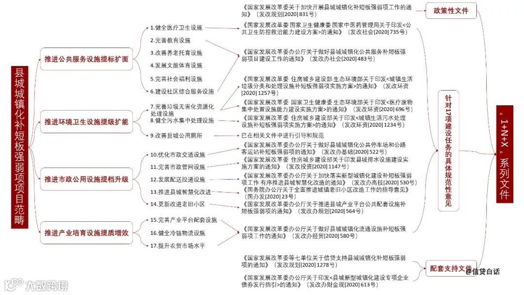 2020年8月14日,国家发展改革委以及国家开发银行、中国农业发展银行、中国工商银行、中国农业银行、中国建设银行、中国光大银行等七单位联合下发《关于信贷支持县城城镇化补短板强弱项的通知》,明确了信贷支持的领域、信贷条件以及配套政策。