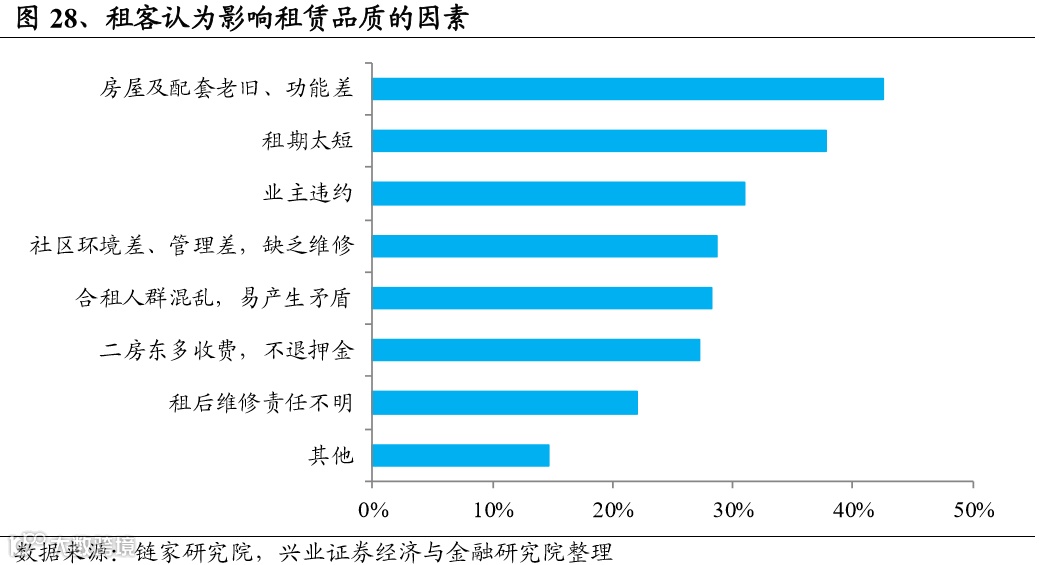 3)从供给端来看,当前租赁市场问题众多,租赁房可以解决。租赁房市场的机构渗透率仅2%,未来提升空间巨大。当前租赁市场中,租客获得的服务体验普遍较差。根据链家研究院的统计,房屋配套老旧、功能差是租客认为最影响租赁品质的因素,其次是租期短、业主违约等。这一系列问题在租赁房专业租赁机构介入后都能得到很好解决。