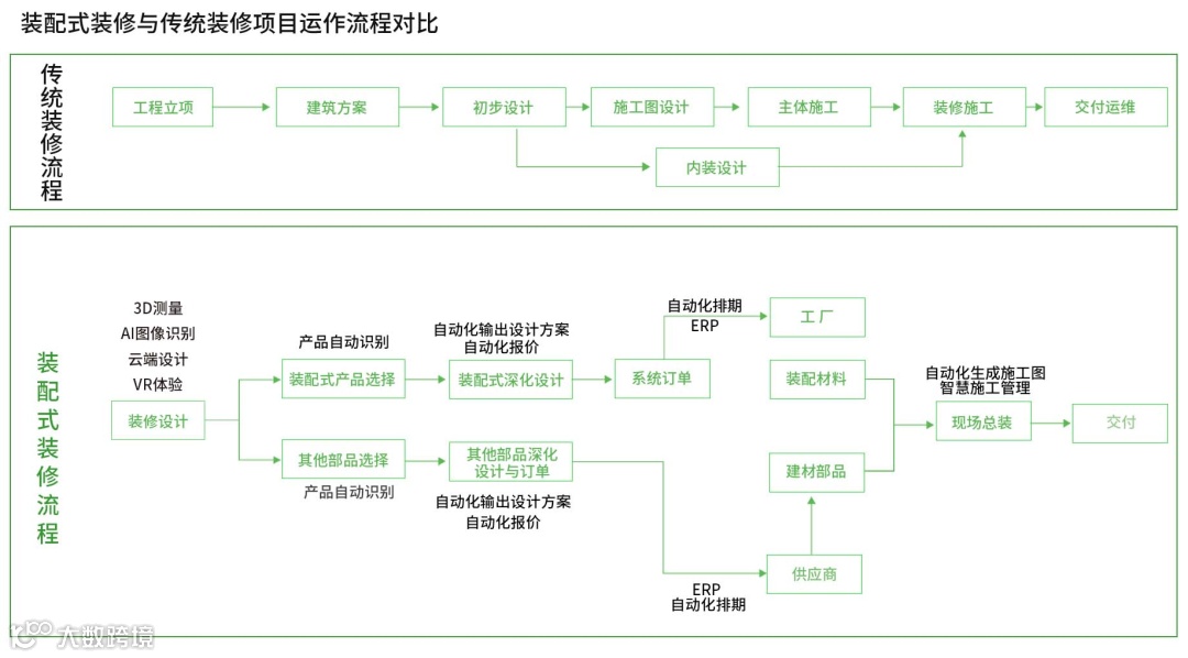 (1)从项目运作流程来看,装配式装修的方案阶段和施工阶段前置,与建筑方案同步设计、施工。