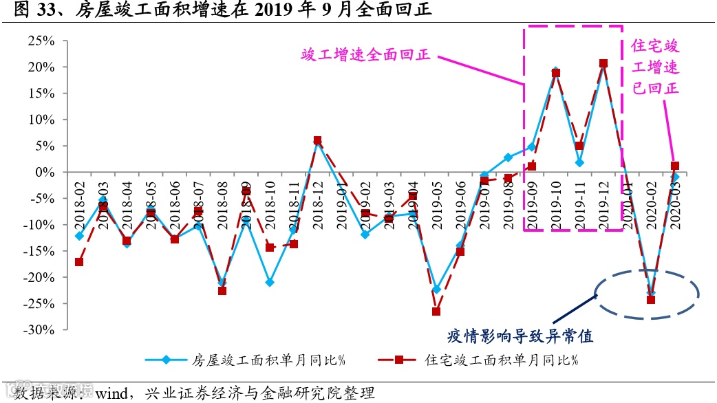 2)从月度数据来看,地产房屋竣工面积增速在2019年8月转正, 9月住宅竣工增速回正,地产竣工中住宅占比较大,地产房屋竣工增速趋势基本与住宅保持一致。2020年2月受新冠疫情增速为异常值,3月已明显改善,住宅竣工增速已回正至1.2%。