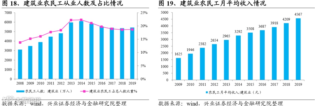 根据国家统计局的数据,当前建筑行业农民工从业人数在逐步下降,农民工平均收入上升较快,农民工老龄化趋势明显,人口红利正在逐渐消失。具体来看: