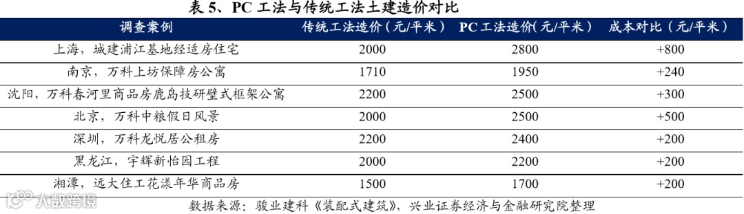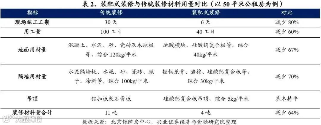 (3)从建造环节来看,由于装配式装修分为工厂部品生产+现场安装两部分,工厂部品生产不影响工程进度,而现场安装要求全部采用干法施工、没有二次加工,因此施工周期相比传统方式大幅缩短。根据北京保障房中心的经验数据,一套50平米的公租房采用装配式装修工期仅需6天,而传统装修工期为30天,施工效率提升明显。