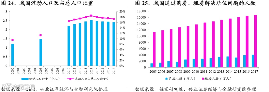 2)从需求端来看,高基数流动人口向大城市集中奠定了租赁需求基础,限购+高房价提升租赁需求。房屋租赁需求主要来自于流动人口,2014年以前我国流动人口总体呈增长趋势,14年以后虽然略有下降,但整体仍处于高位。截止2018年末,流动人口2.41亿人,占总人口比重17.27%。庞大的流动人口奠定了租赁市场发展的基础。根据链家研究院的统计,2017年我国采用租房解决居住问题的人口约为1.68亿,是通过买房解决居住问题人数的4倍。