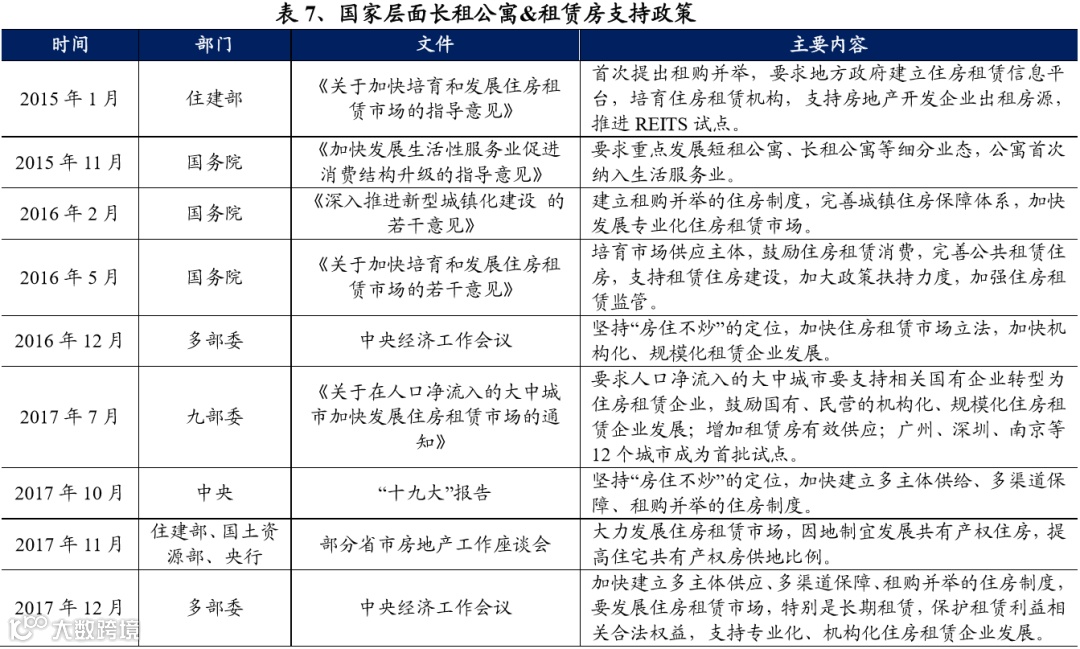 1)从政策端来看,顶层设计逐步完善,各地激励政策加速出台,租赁房健康快速发展有保障。2015年1月住建部就发布了《关于加快培育和发展住房租赁市场的指导意见》,要求地方政府建立住房租赁信息平台,培育住房租赁机构,支持房地产开发企业出租房源,推进REITS(房地产投资信托基金)试点。2016年5月,国务院要求加快培育和发展住房租赁市场,培育市场供应主体,鼓励住房租赁消费。2017年7月九部委联合出台租赁支持政策。“十九大”报告中再次强调了房住不炒,租购并举的住房制度,将租赁房的政治地位推向了新高度。