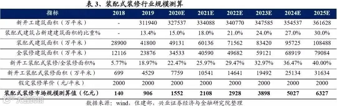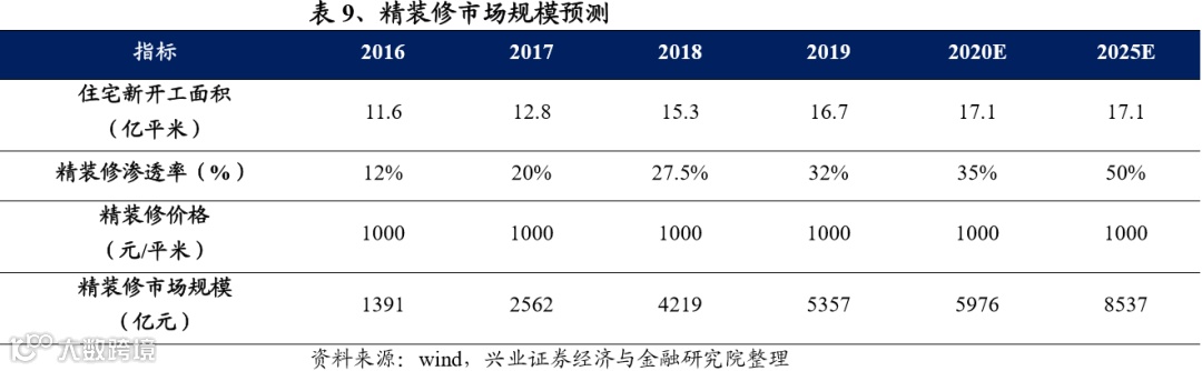 2)2017/2018/2019成品住宅渗透率为20%、27.5%、32.0%,我们假设2020年成品住宅渗透率为35%,2025年达到50%。