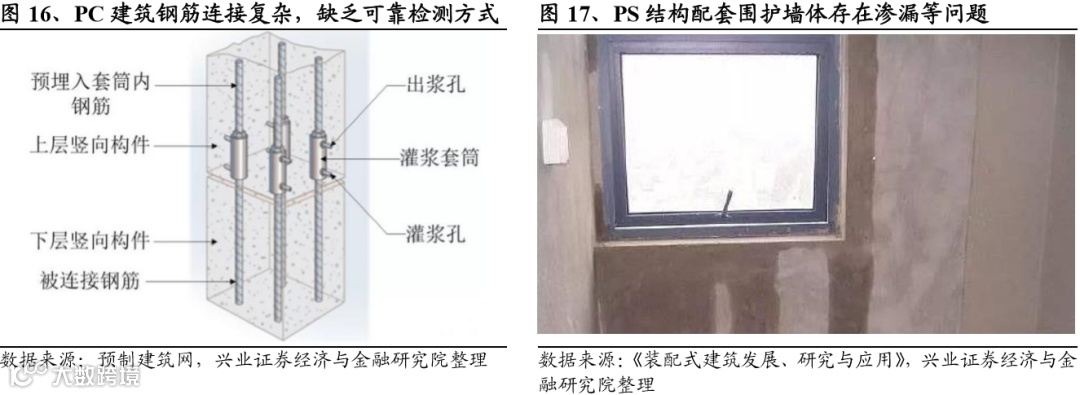 PC结构的技术难题在于施工工艺复杂。传统混凝土结构采用现浇方式施工,施工工艺粗放。改用装配式后,现场施工从支模+现浇改为吊装+节点现浇,由于混凝土构件自重大,对钢筋位置有较高的要求,吊装难度大;构件之间的钢筋采用灌浆套筒或螺栓等方式连接,尚缺少可靠的检测方式。