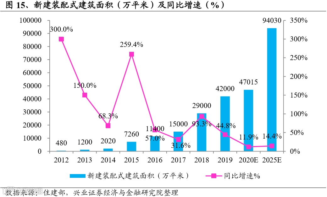 根据住建部的统计,2012年以来装配式建筑实现了快速发展。2019年新建装配式建筑面积已达42000万平米,同比增速44.8%,占新建建筑面积的比重为13.4%。假定每年新建建筑面积不变的情况下,按全国装配式建筑占新建建筑的比例达到15%计算,2020年新建装配式建筑面积将至少达到47000万平米,同比增长11.9%;2025年新建装配式建筑面积则将达到94000万平米,年化复合增速为14.4%。