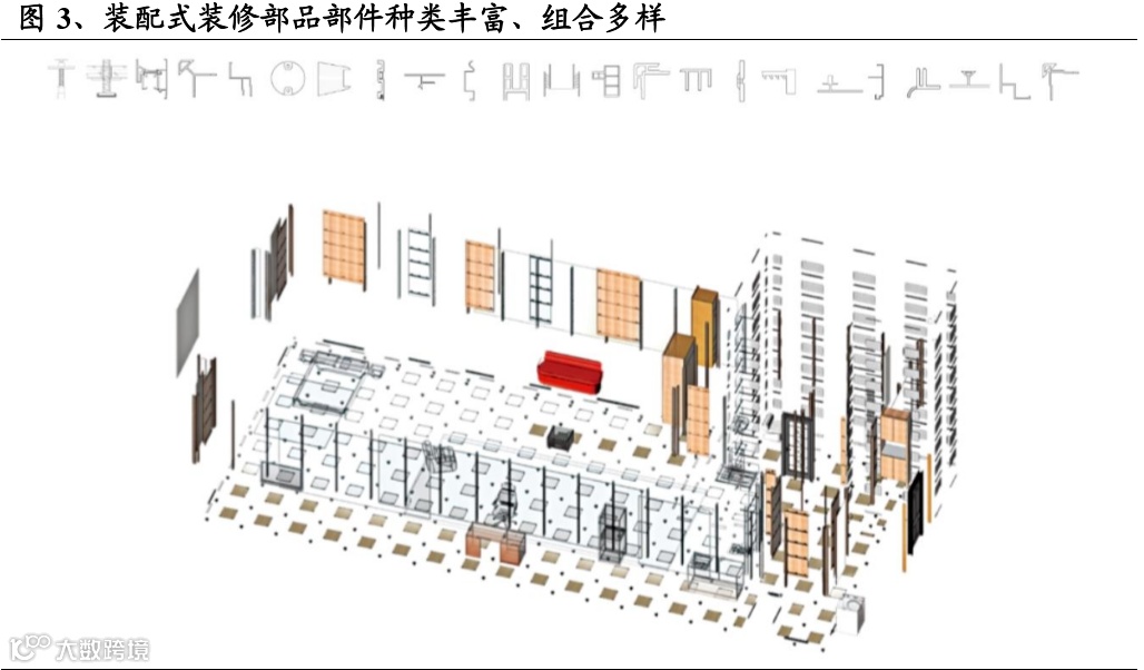 (2)部品部件供给有限,具有规模效应的龙头企业将引领行业发展。相比传统装修,装配式装修的主要生产流程在工厂,现场只做安装工作。目前来看,专门做装配式装修配套部品部件的厂家还较少,供给上存在空缺。我们认为供给不足是装配式装修价格高、个性化程度低的主要原因,供给端具有规模效应的龙头企业将有明显竞争优势。