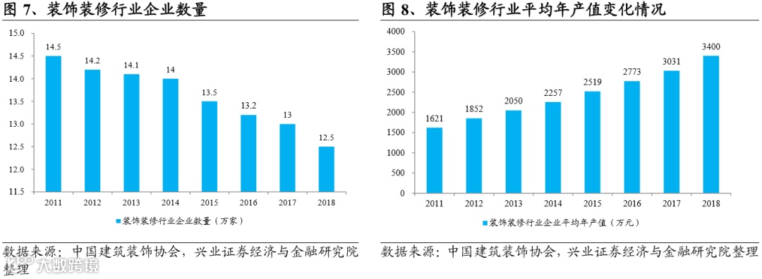 行业弱者加速淘汰,但“大行业、小公司”的竞争格局依然没变。根据中国建筑装饰协会发布的《中国建筑装饰蓝皮书》统计,我国装饰装修企业的数量在2011年为14.5万家,到2018年减少至12.5万家,总体减少了近2万家企业;2015年清理挂靠以来,企业数量下降呈现加速趋势,仅15-18年就减少了1.5万家。从企业平均产值规模来看, 2011年平均产值为1621万元, 2018年提升至3400万元,年化复合增速达11.2%。我们判断被淘汰的2万家企业以低资质、小规模的装饰装修企业为主。但从平均产值规模的绝对值来看,2018年也仅为3400万元,企业平均规模依然较小,行业“小而散”的格局并没有改变。