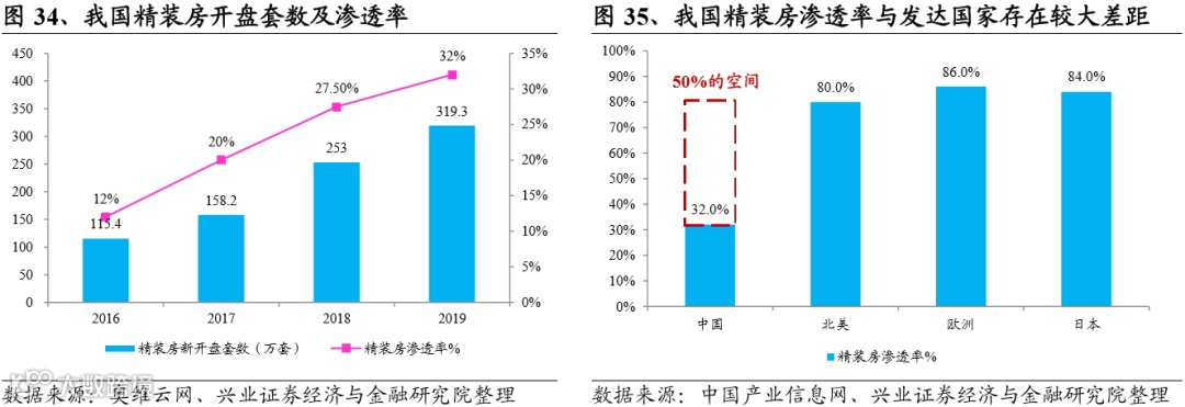 住建部早在2002年就曾推出《商品住宅装修一次到位实施细则》,所谓装修一次到位,就是指全装修。全装修住宅既绿色环保,又提高了服务质量、降低了装修成本,看起来是大势所趋了,理应得到推广。但时隔多年,全装修的渗透率依然不高。根据奥维云网的数据,我国2016年成品住宅渗透率仅为12%,17、18年有大幅上升,2019年成品住宅开盘套数319.3万套,渗透率达到32%,已接近“十三五”规划的30%,但与发达国家80%以上的渗透率相比还存在较大差距。因此,我们判断,未来成品住宅渗透率绝对不仅限于30%,还会有更大的向上空间。