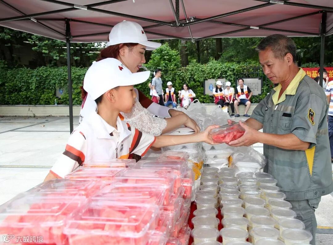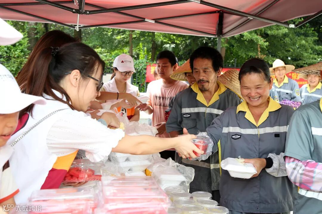 烈日当头,室外温度高达38℃,棠下幸福广场随处可见志愿者忙碌的身影,他们的衣服已经被汗水浸湿,脸颊晒得通红,但没有一位志愿者因此放下手中的工作而停下休息,只为能让环卫工人在他们休息时间吃上我们精心准备的爱心午餐和水果。在献上爱心午餐的那一刻,环卫工人对我们露出了淳朴而欣喜的笑容。