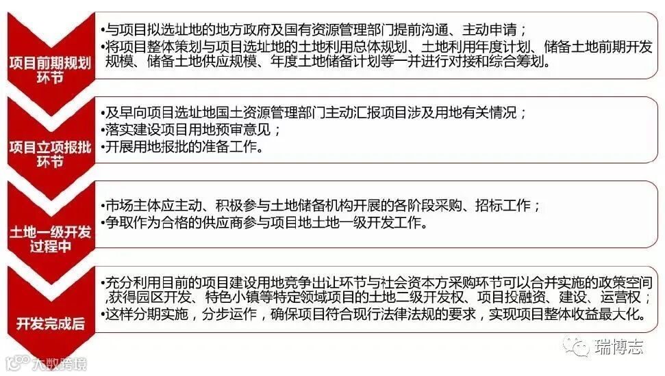 特色小镇土地一级开发工作与项目前期规划、项目建设以及后期产业导入、产业服务等环节之间存在内在联系,关联度很高,因此,参与特色小镇一级土地开发建设的市场主体在开发过程中要仔细考量与政府的合作模式,既要遵循此类项目投融资、建设、运营环节紧密联系、相互运作的规律,又要确保参与程序规范合法。期间,各环节注意事项如下: