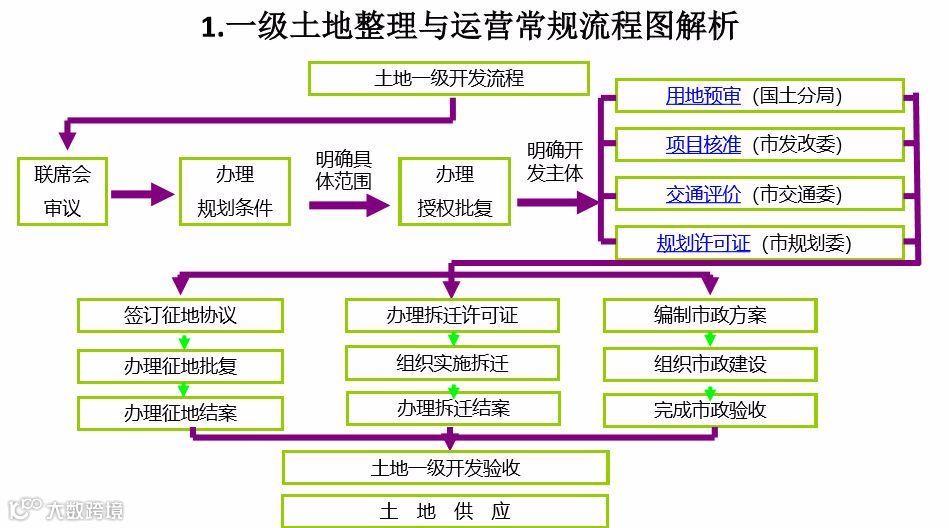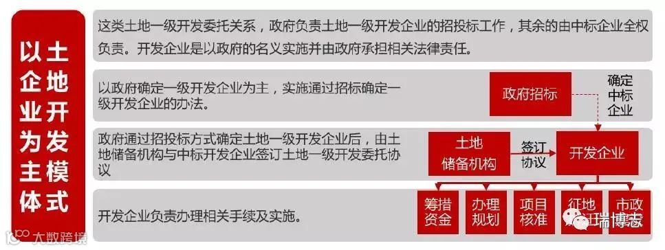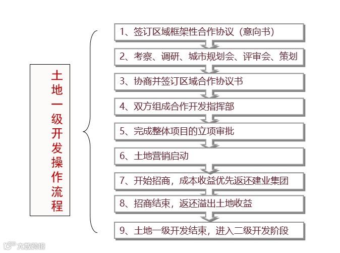 按照国民经济和社会发展规划、城市总体规划、土地利用总体规划和城市土地储备供应计划要求,将列入城市土地储备供应计划的开发项目,在确定土地开发综合策划方案后,以政府委托或公开招标的方式确定一级开发主体;获得土地项目一级开发权的开发主体,再根据“政府主导、统一规划、市场化运作”的原则,运用现代项目管理的理论、系统和方法,组织实施土地开发项目征地、拆迁、规划设计、市政基础设施和配套建设、交通建设、投融资,并未二级开发商(单纯房屋开发)服务。