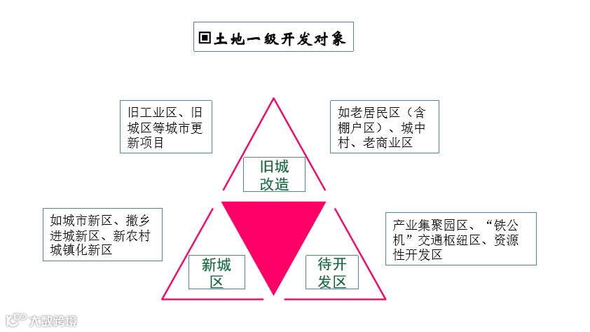 按开发性质分类:存量一级开发:包括旧城改造、旧村改造、城中村改造及退二进三(工业厂区改商业、住宅等第三产业)项目。增量一级开发:包括征用和农转用土地,有些是已纳入城市总体规划的成片征地开发,有些是总体规划区以外单独立项基建类项目。
