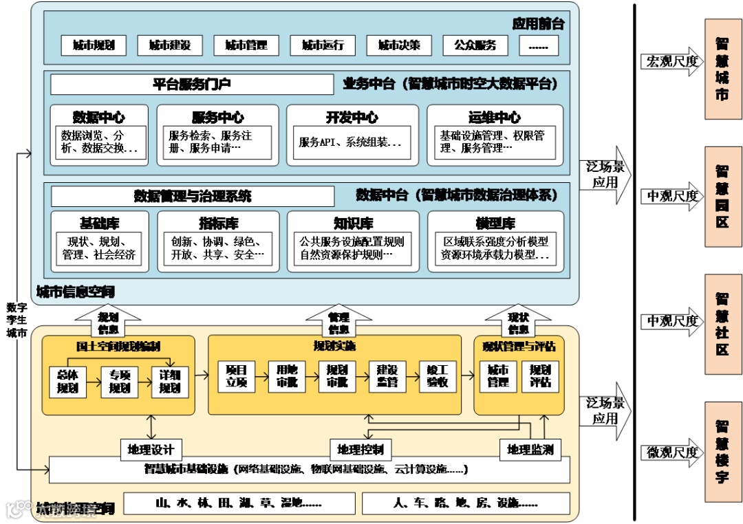 国土空间规划是城市发展决策体系的重要组成部分,是通过总结城市历史发展经验,结合城市现状和社会发展需求,利用新一代信息技术手段,形成的面向未来的城市发展框架。同时,国土空间规划是对未来城市的综合设计,通过规划实施和规划监测评估工作,对城市的建设活动、资源保护情况以及城市综合管理状况进行底线管控和监测监管,无论宏观尺度的智慧城市建设、中观尺度的智慧园区和智慧社区建设,还是微观尺度的智慧建筑建设,均遵循“先规划、再建设、再管理”的建设路径,形成了“规、建、管”一体化的“泛场景”智慧城市总体框架,如下图所示: