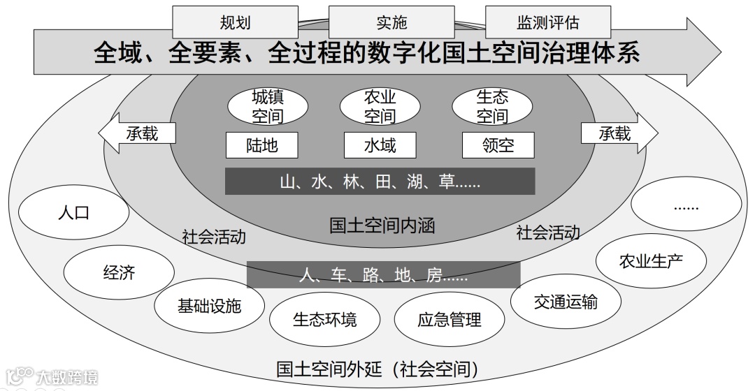 城市物理空间承载了国土空间的山、水、林、田、湖、草等自然要素,以及人、车、路、地、房等社会要素。其中,城市建设活动在社会发展中起到重要作用,总体上涵盖了国土空间规划编制、实施和监测评估全过程。一方面在规划编制阶段,通过构建城市国土空间总体规划、专项规划、详细规划成果,对自然和社会要素的保护和发展格局进行合理设计和优化配置。另一方面,在规划实施阶段,通过对建设项目从立项、用地审批、规划审批、建设监管到竣工验收全过程进行规范化控制,可保障城市建设的有序推进。另外,在规划实施评估阶段,通过卫星遥感、现状调查、城市大数据等地理监测手段,能更准确、更快速地把控城市综合运行情况,及时发现城市运行中存在的问题并及时预警。