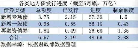 从发行进度看,截至5月末,地方债合计发行3.2万亿,意味着剩余还有约3.3万亿的地方债待发行,其中新增地方债剩余额度约2万亿。